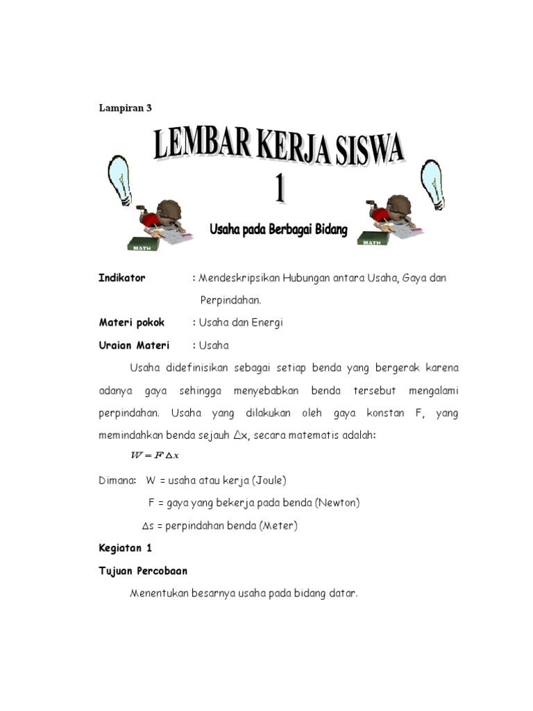 Dokumen.tips Lamp 3 Lks Usaha n Energi Smp (Cole Herrera) Ketik namamu dulu sebelum mulai mengerja. Itulah pembahasan Quipper Blog kali ini tentang usaha dan energi. Untuk itu, simak yuk pembahasan lengkapnya mulai dari pengertian sampai contoh soal.