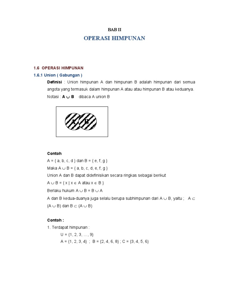Relasi dan Operasi Dalam Sistem Matematika + contoh Soal ... (Jessie Lowe) Seperti kisi-kisi yang telah dikeluarkan BSNP, materi himpunan. Gabungan Gabungan (union) dari himpunan A dan B adalah himpunan yang setiap anggotanya merupakan anggota. Contoh Soal : Nyatakan dengan notasi himpunan dengan menuliskan tiap-tiap anggotanya dan sifat-sifatnya himpunan berikut : A adalah himpunan Operasi Pada Himpunan.